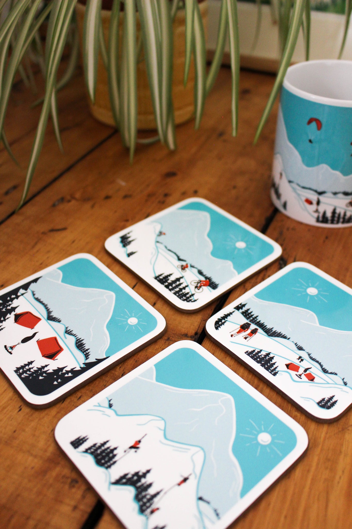 Set of 4 Summer Sports Coasters, Summer Activities Coasters, Cycling, Hiking, Mountain Biking, Camping, Climbing.