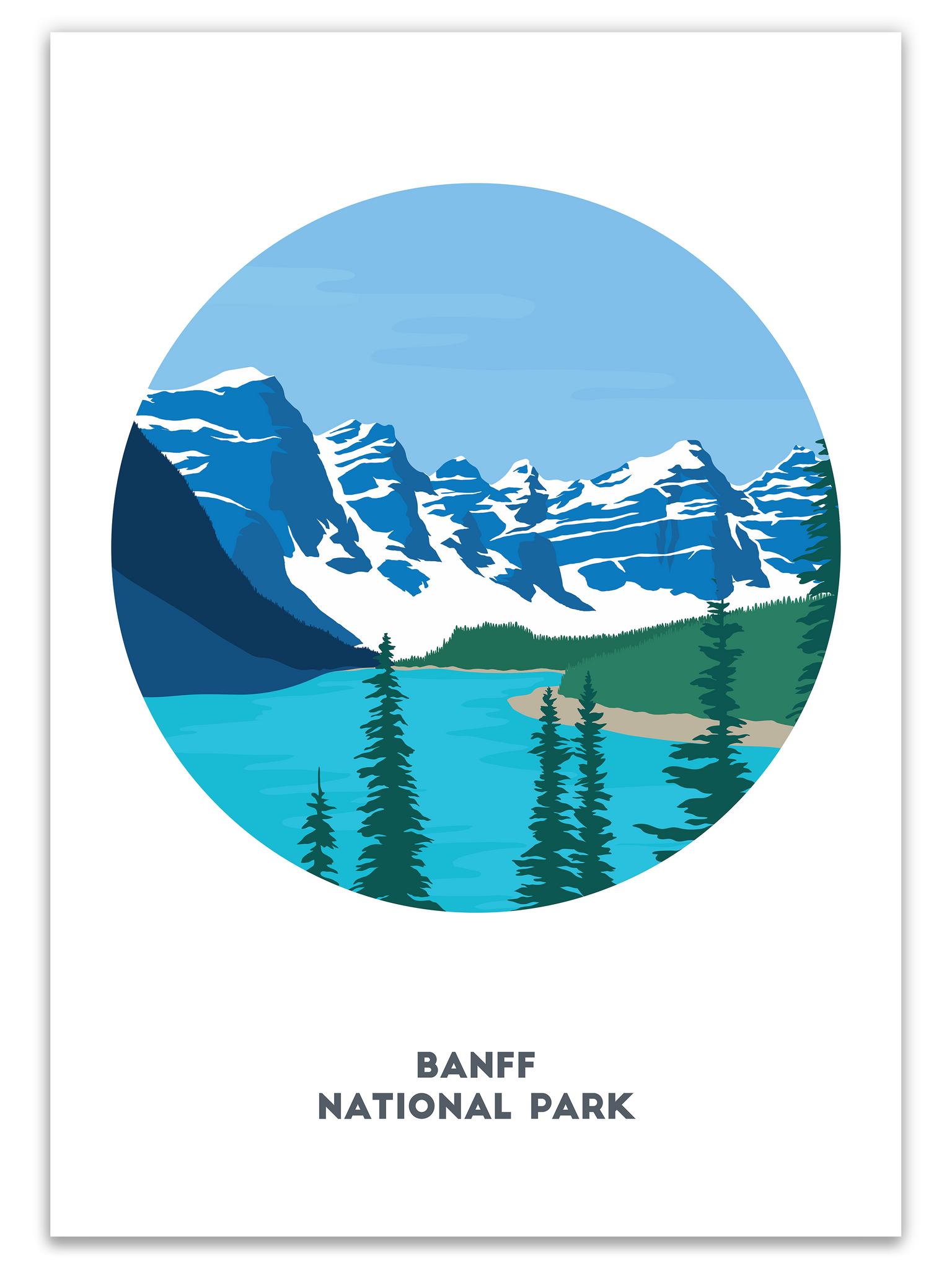 This is a contemporary illustration of Banff National Park in Canada. The print uses simple and bold shapes to capture this iconic location. The colours are striking and display Moraine lake in its full azure blue glory.