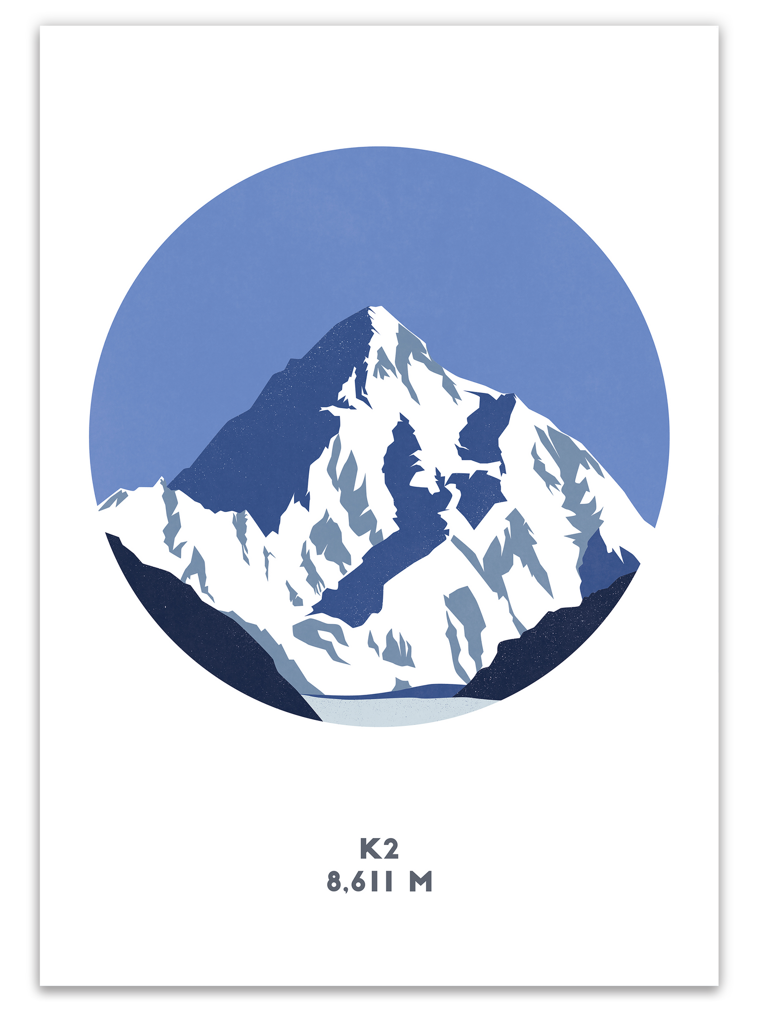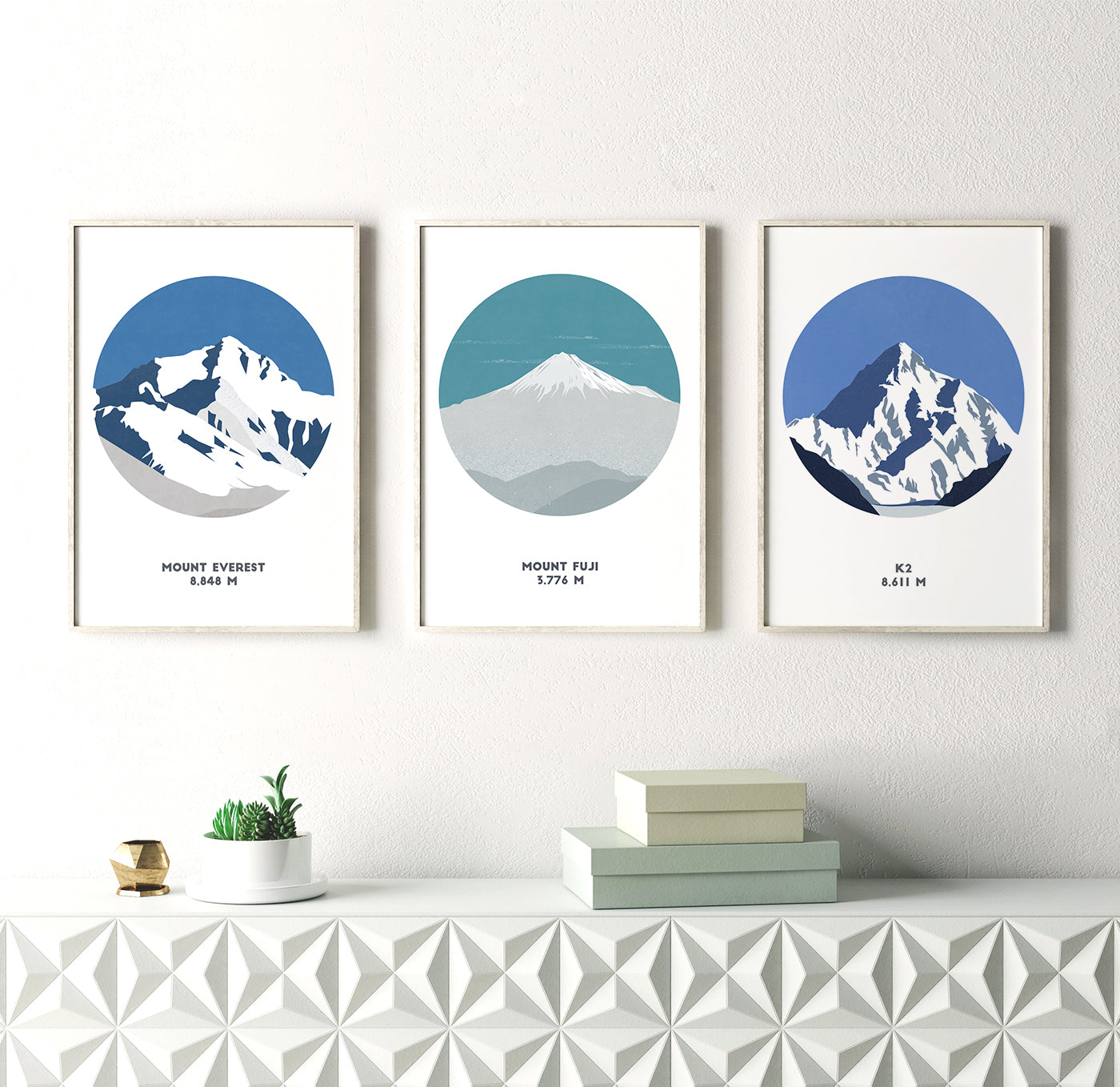These are three contemporary illustrations of some of the most impressive mountains in the world. The prints use simple and bold shapes to capture the snow peaked mountains.