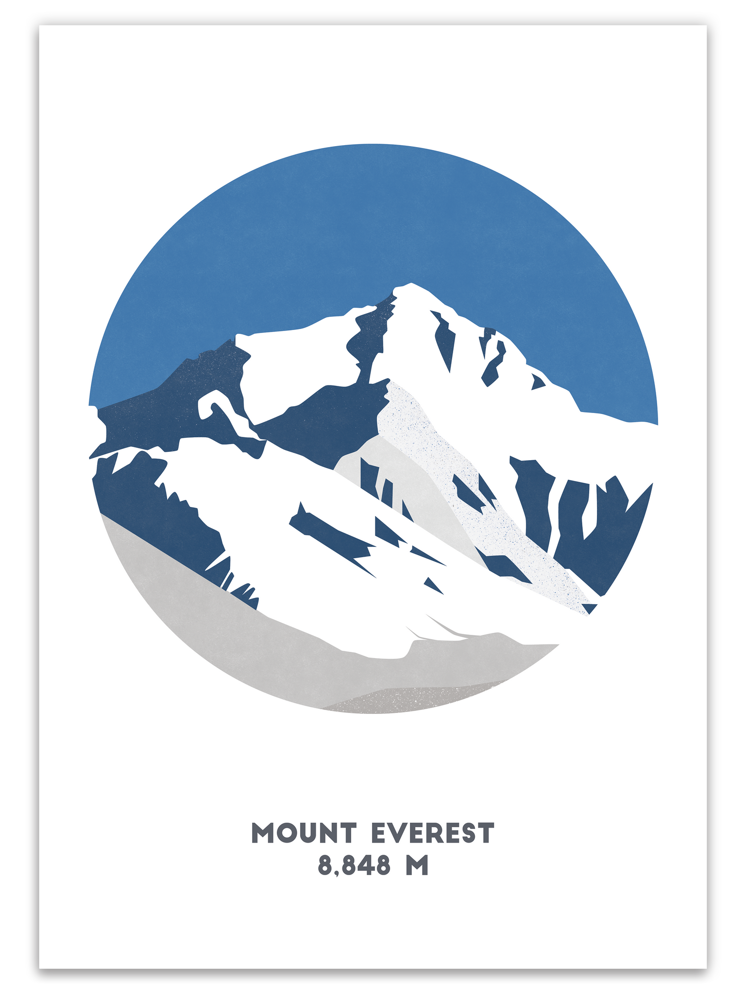 This is a contemporary illustration of the worlds tallest mountain, Mount Everest which stands at a very impressive 8,848 metres above sea level. The print uses simple and bold shapes to capture the vast size of the mountain and its surrounding lower peaks.