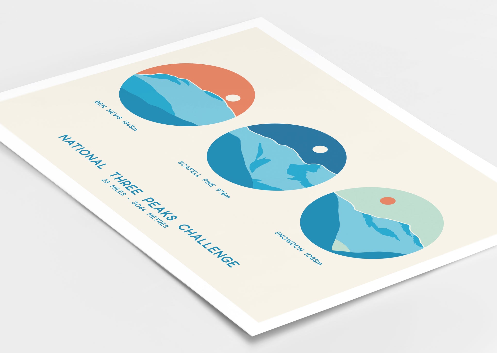 UK National Three Peaks Challenge poster, Ben Nevis, Scafell Pike, Snowdon, Three Peaks