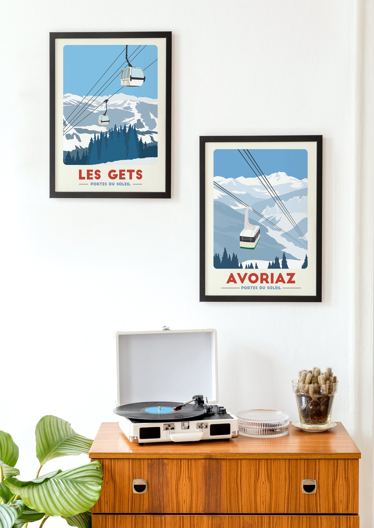 Print only. Part of our series of prints featuring some of the most popular ski lifts and gondolas around the world. This print features the Prodains Cable Car that takes you up to the Avoriaz ski resort.
